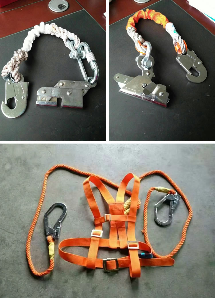 自锁钩使用的绳,要预先挂好。垂直、水平和倾斜均可。自锁钩在绳上可自由移动,能适应不同作业点工作。