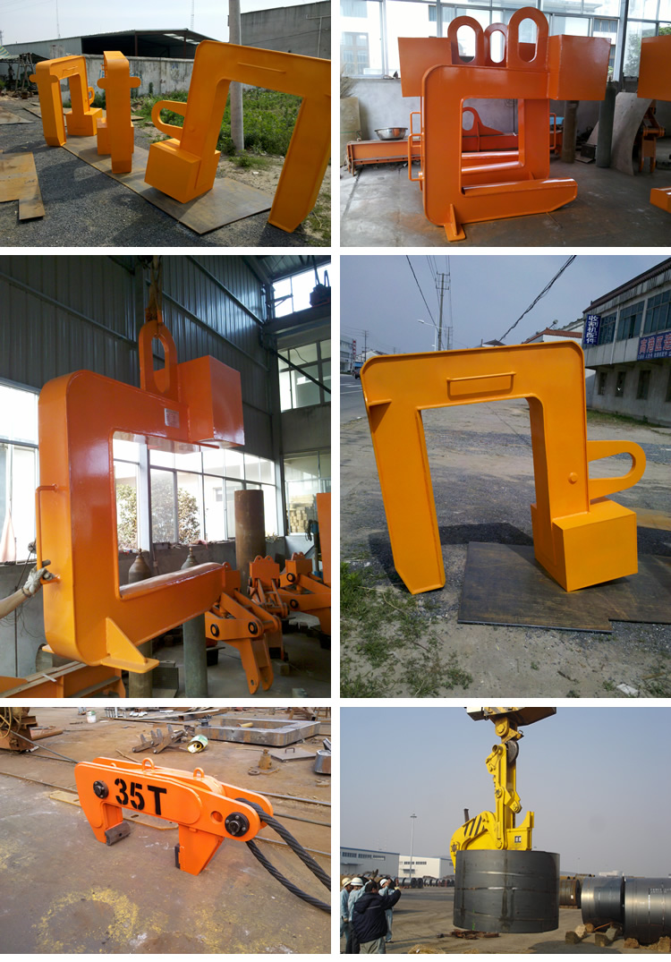 吊梁:吊梁是与天车钩相连的部件,有吊环卸扣式联接、吊索具式联接和吊耳式联接三种结构。吊环卸扣式联接吊轴,使吊具的受力情况改善,同时也避免了装卸钢坯时的脱钩现象,降低了夹具本身的高度,有利于低矮的场所使用。吊索具式联接吊轴,使夹具的受力较好,但吊具自身的高度大,需在高大的场所使用,在挂吊钩时需用人工进行辅助挂钩。吊耳式联接吊轴,可由吊车司机直接挂钩, 但在吊装作业时需使吊具着地,并下放吊钩直至不受力为止,这样,易导致吊车钩脱钩。