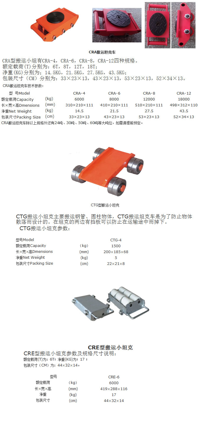 搬运小坦克特点:中心低,操作安全,适合于重物器具的搬运工作。搬运小坦克可以单独使用,搬运小坦克也可以多个一起使用。